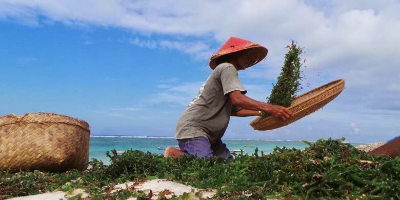 para pemungut rumput laut untuk terus menyusuri pantai di Desa Kutuh